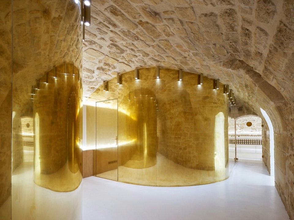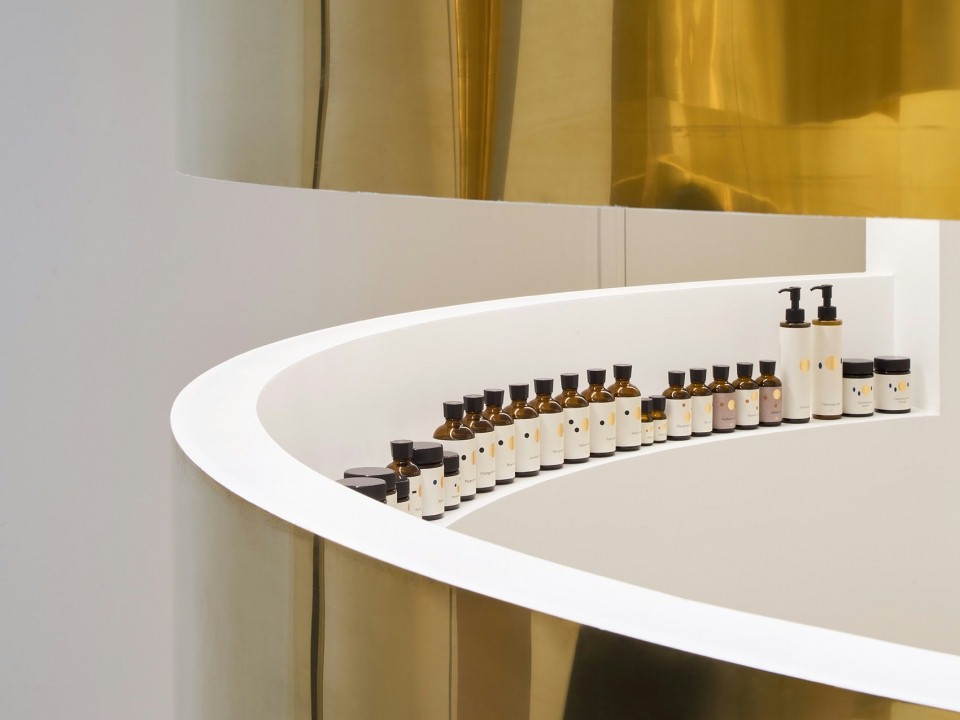 设计理念/这是一个新美容品牌而设计的精品店。设计师保留了大部分的原始结构,增设了不同的隔断来满足空间需要。圆弧形的隔断创造了更圆润的空间。圆弧内部采用白色饰面,为客人营造一个纯净的空间。客人不能直接进入提供各种服务的房间,而是需要沿着弯曲的小路通往自己的目的地。给客户带来一种神秘的期待感。亮黄铜饰面,为空间带来温暖的多方向光反射,提供了一个优雅又特别的空间。