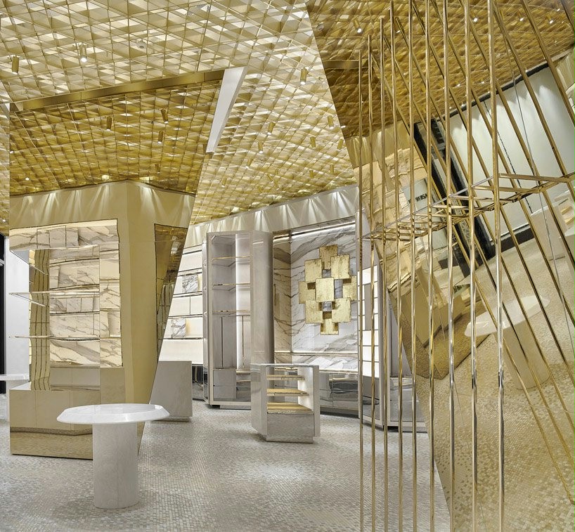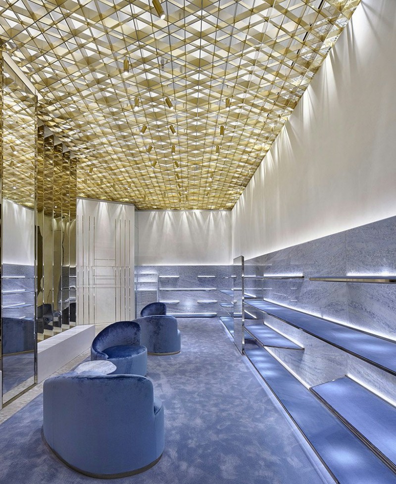 设计理念:前卫创新新概念店。富有质感的室内元素,让顾客感到惊讶。店的金色让整体变得更加高端神秘,符合了品牌的定位。天花板上有钻石形状的图案,设计了商店的流程,引导游客流畅地从一个房间走到另一个房间。白色大理石与金色得搭配,使店内变得明亮起来,给顾客一种舒适的购物体验。