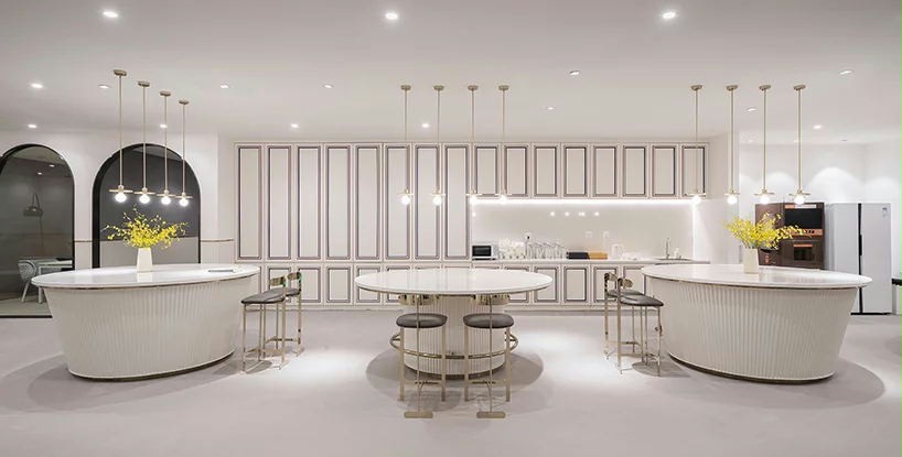 四层空间的办公室,每一层都注入了不同的色彩。入口通往餐厅空间,以一个形状像热气球的大型艺术装置为特色。电梯附近的空间也是一个公共接待区,周围有大面积的办公区域,让每个公司的员工都可以非常方便的到达自己的工作区域。通过大面积的木皮贴面和灰褐色的混凝土涂层,赋予这一楼层整体空间稳重成熟的氛围。运动空间的展示,让员工可以锻炼身体,为办公空间增添了一份活力。