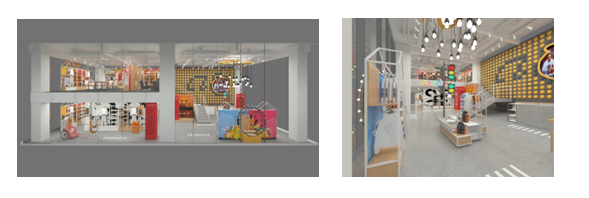 橱窗作为一种艺术的表现,是吸引顾客的重要手段。本案在橱窗展示区放置了定制的的趣味摆件、梦幻的粉色小推车、公共电话亭的模型等,通过这些生活化场景既让顾客感到亲切自然的同时又使空间显得俏皮温馨。此外,别出心裁的在局部展示窗上贴了品牌动画形象,巧妙得使顾客将品牌更深的印入脑海。